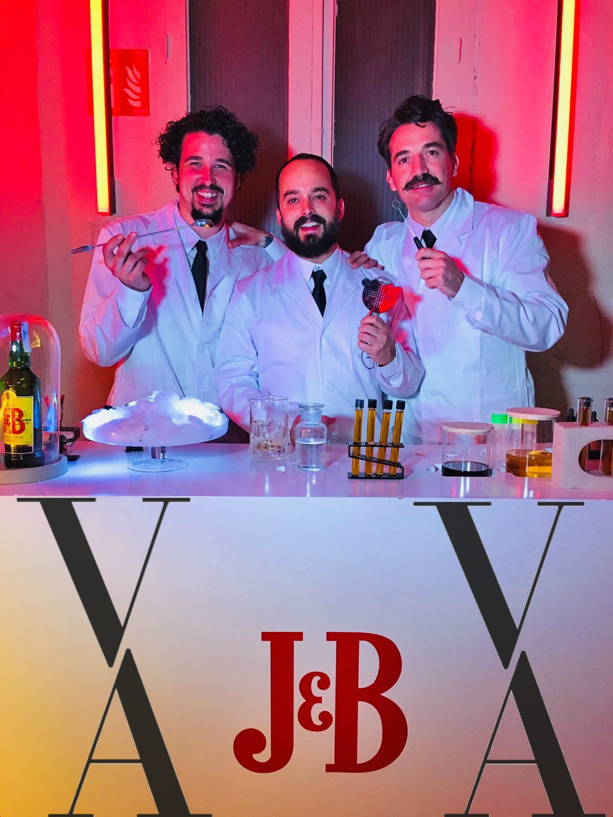 El estudio de cocteleria 80-20ml & Plat Institute, reconocidos con el premio Alimentaria, se han unido en una investigación sobre nutrición alta gastronomía y cocteleria , como auténticos doctores o científicos crearon unas pompas comestibles de JB con sabores que estallan en la boca y maridados con otros shots que se servían en probetas.